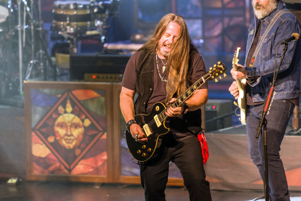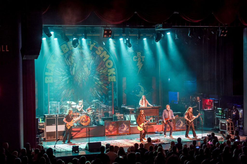 Exactly at 8:45 pm, the lights went down. Blackberry Smoke casually came out for their Rattle, Ramble and Roll tour stop in Ft Lauderdale at the glorious venue, The Parker. It was the perfect venue for them, with fabulous sound and lighting. There was this wall of sound that was rich, vibrant and clear, from start to finish. The entire audience was excited and on their feet for almost the entire performance. They have been together for almost 25 years and have been collecting dedicated fans, in addition to collecting multiple hit songs and albums. There were loads of loving fans at the concert from their many rock and roll cruises. This tour is celebrating their Nov 14th compilation album release, Rattle, Ramble and Roll: The Best Of Blackberry  Smoke, Volume One. It is their first greatest hits album. They are a super live band, confident and comfortable in their skins. This is a band that is down to earth and very close with their audience. Their fans’ adoration is clearly evident. As one fan put it, “I’m spreading the smoke, everywhere I go.” Their fan club is called The Smokers Lounge. They are Southern Rock at its finest. Originating from Atlanta, they consider themselves a rock n’ roll band, even though they love country music. They are true music lovers and not confined to one genre. The band consists of Charlie Starr (Charles Webb Gray) on vocals and lead guitar, Paul Jackson on lead/rhythm guitar, Benji Shanks on guitar, Brandon Still on keyboards, Richard Turner on bass, and drums by Kent Aberle. Sadly, Richard’s brother and original founding drummer, Charles Brit Turner, who went by Brit, passed away from brain cancer in 2024. They have a memorial onstage for him with three giant letters CBT on a stained glass looking backdrop, as he was such a major part of the band. Charlie said during the concert, “Let’s do one for Brit.” The song they did in his memory was “Always Be Right Here,” which is a lovely song with a great melody. On another song, Charlie said, “You all look beautiful tonight” before he broke into “Pretty Little Lie” from 2012. This leads one to wonder if maybe he was lying about everyone looking beautiful…. a pretty little lie, perhaps?