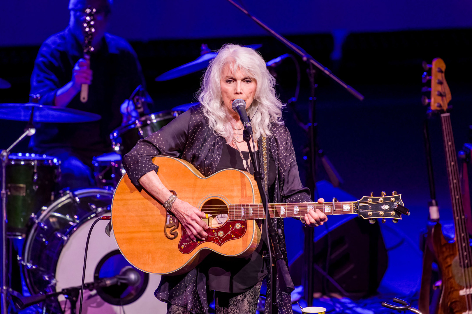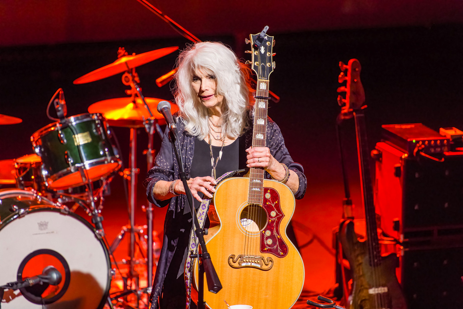 “Here I Am” is one of Emmylou’s best songs and features her playing her Gibson L-200 Emmylou Harris Signature guitar, but it’s her voice that is an instrument in itself. It’s the voice of an angel and it excels here. She played Gillian Welch’s “Orphan Girl” and did the original justice. She joked that she wasn’t an orphan and that her brother was in the audience. She said, “A great brother is a joy forever. He turned me on to Country music, but I didn’t listen at first.” Then she fell in love with it. Their set was so varied and flowed beautifully. She played “Love and Happiness” that she had written with Kimmie Rhodes and had done a duet with Mark Knopfler on their superb album All The Roadrunning. They also played the song “All The Roadrunning” with fiddle and accordion giving it a beautiful Irish feel. It was another highlight. She mentioned that they don’t get out as much as they used to, but they like to rock it. She started her own song “Michelangelo” from her Grammy winning Red Dirt Girl album and forgot the words and joked that she’ll just mumble it. She said she knows 500 songs, and it was funny that she stumbled on one of her own songs. She restarted the song with ease and humor, and it was a complete success the second time.