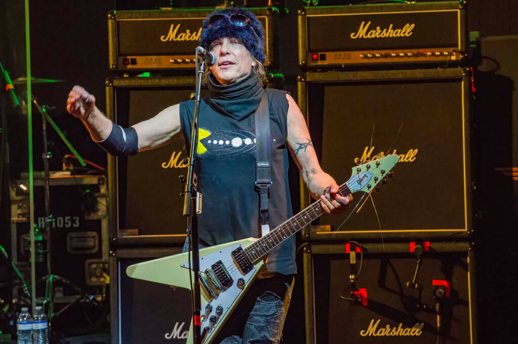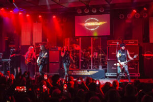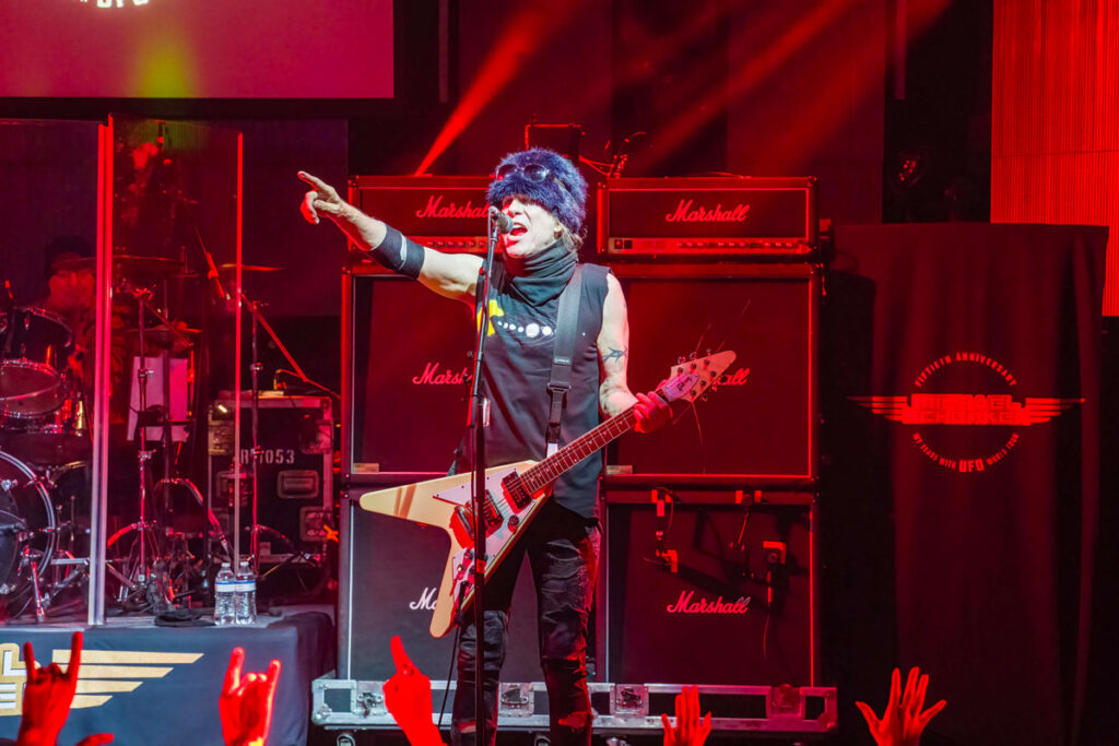 There were several instances over the evening where keyboard player/rhythm guitarist Steve Mann would trade guitar solos with Michael, it was definitely ear candy for the multitude of guitar players in the audience. One thing that made me leery was the fact that Michael does not clip the end of his strings, nor does he even loop them. There were six pointy edges sticking out at the end of his headstock, and I winced every time he got near someone thinking an eye might get taken out. For the drummers in the crowd, there was a drum solo after the song ‘Lights Out’. Singer and frontman Robert Liapakis did a fine job with the vocals as well as interacting with the crowd. There seemed to be some technical difficulties after the song ‘Reasons Love’, so we were treated to a band jam while the situation with Michael’s guitar was resolved. Luckily, the difficulties only lasted a couple minutes and all the guys were back in for the final song ‘Rock Bottom’. As they were taking their bows, Michael grabbed a camera and took several selfies with the crowd behind him. The guys never really left the stage so I’m not sure if it was technically an encore, but they then started playing ‘Shoot Shoot’ and finished the night with ‘Too hot to Handle.’