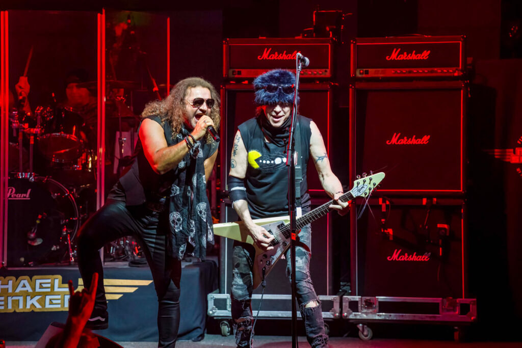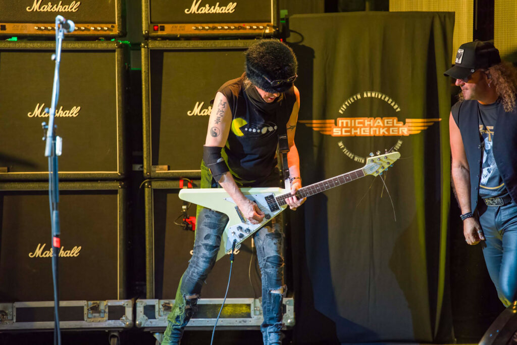 At about a quarter past 9, after the stage had been reset, the PA system started playing Led Zeppelin‘s ‘Immigrant Song.’ Many in the full house were aware that this is the song the band takes the stage to, and the crowd really came alive! The current members of the Michael Schenker Band took to their spots on the stage and awaited as Schenker himself appeared with his fur bucket hat and white Flying V as the quintet blasted into ‘Natural Thing.’ A few songs later, after ‘Doctor Doctor’, bassist Barend Courbois and drummer Bobo Schopf jammed for a little bit before the entire band came back in for ‘Mother Mary.’